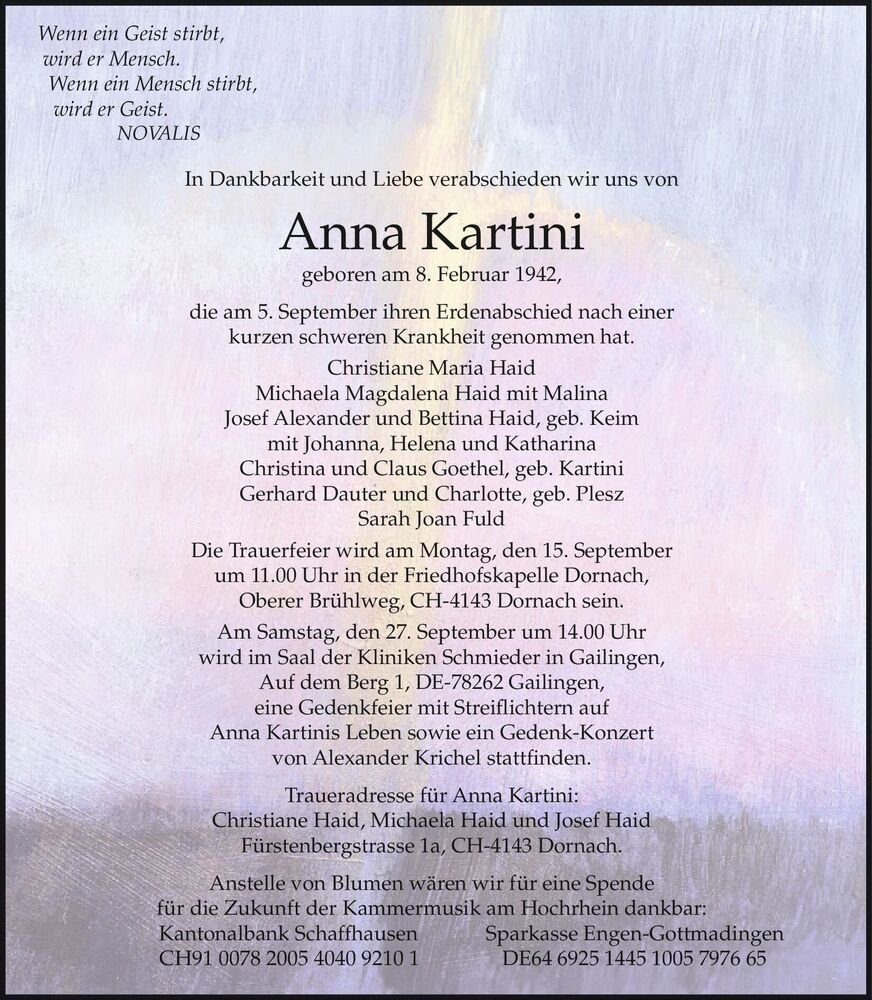 Mit tiefer Trauer teilen wir Ihnen mit, dass unsere liebe verehrte Anna Kartini